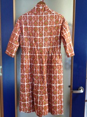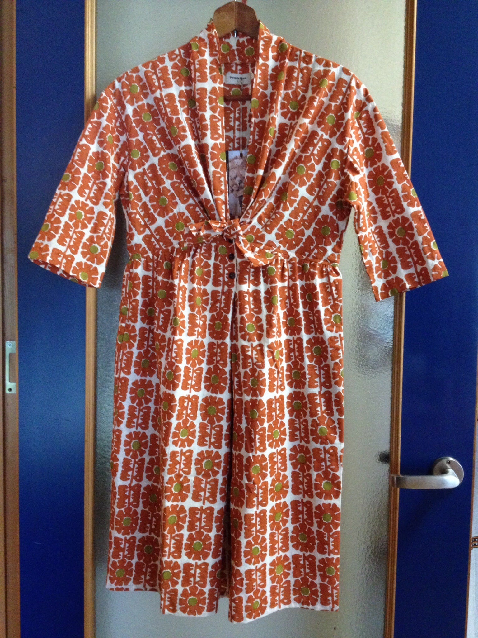 大ぶりの花柄をブロックプリントしたレトロな雰囲気のシリーズ。胸もとのリボンを結んで着こなすドレス。ハイウエストの切り替えが、着た時のシルエットをきれいに映してくれます。