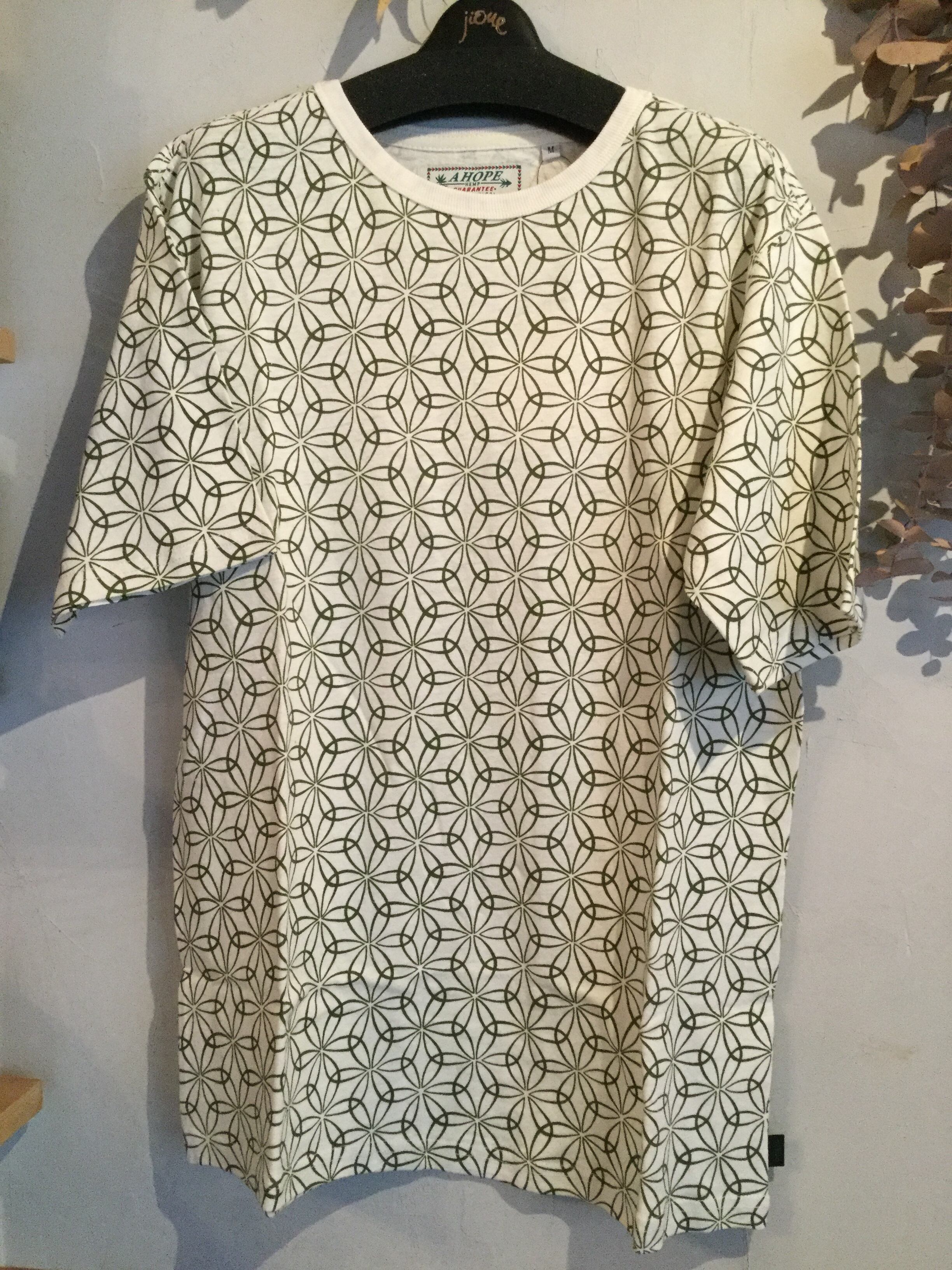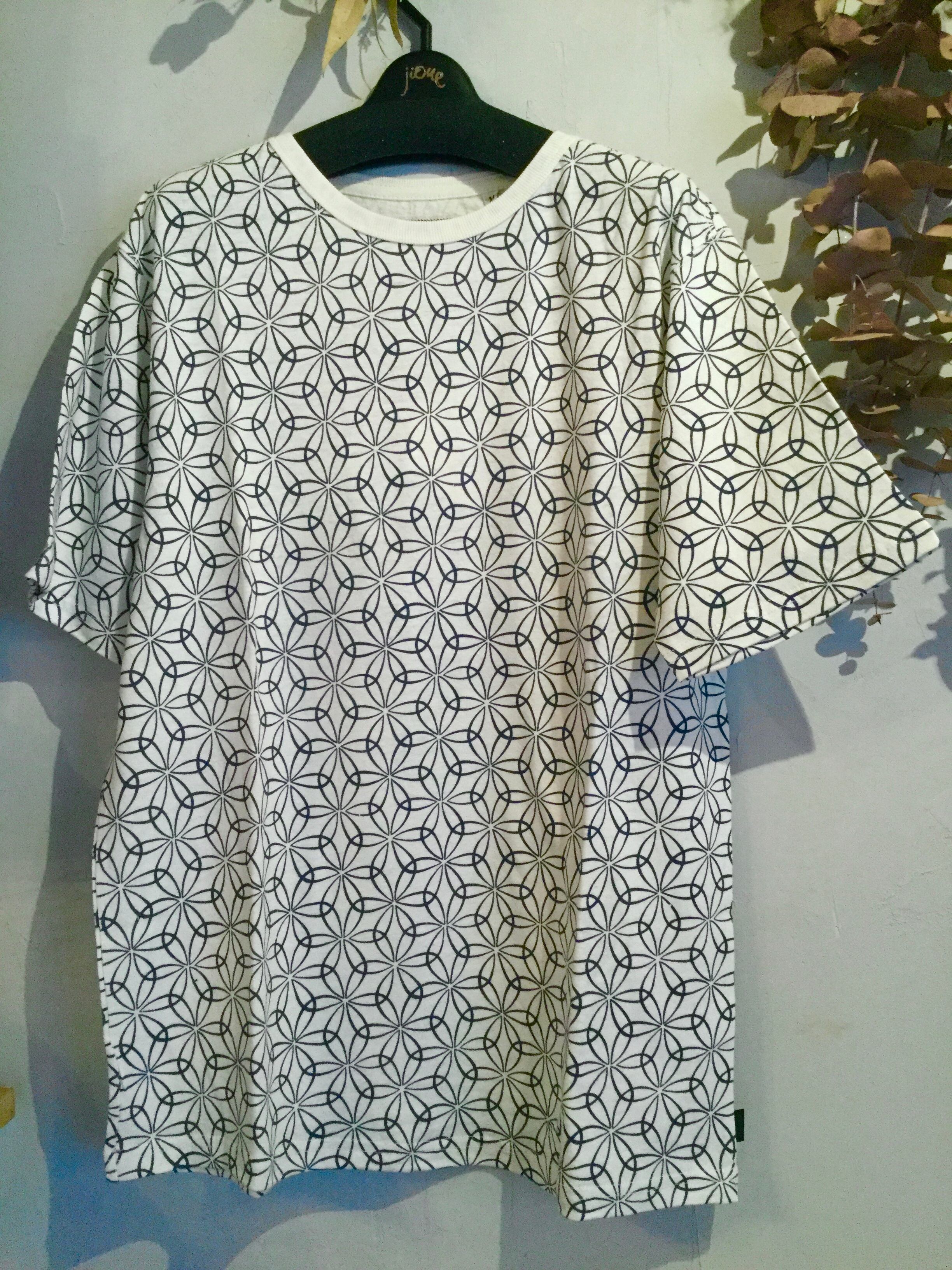 Flower of Life と言われる柄を使った総柄Teeシャツです。版を使って1枚1枚手刷りでプリントしたヘンプオーガニックコットン天竺生地を使用しています。