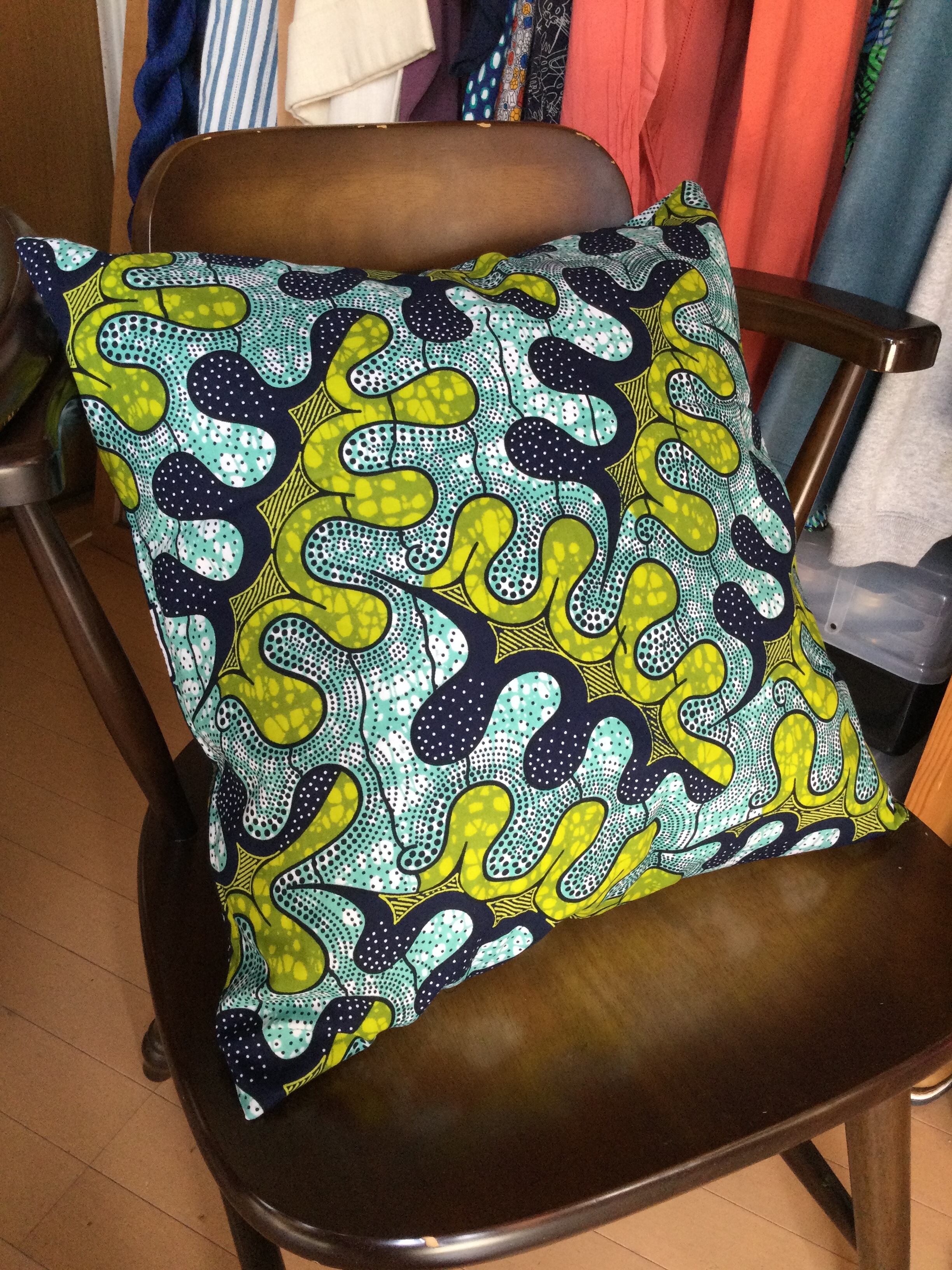 アフリカンワックスプリント生地パーニュを使用し制作したクッションです。